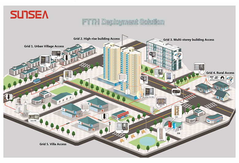 With years accumulation of technology and engineering practice in the field of telecommunication networks and the vision to the development of future network, SUNSEA provides FTTx (FTTO, FTTH, FTTB+LAN,…FTTCab+xDSL) solution based on communication infrastructure equipment and components to domestic and oversea customers. The products cover the scenarios from central office to customer premise, including whole optical products, optical-copper hybrid products and OSP products, etc.